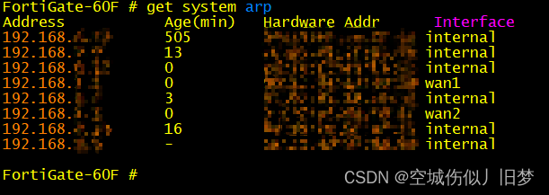 ①通过命令行连接飞塔防火墙,使用命令get system arp查看当前ARP信息(此时局域网内PC主机必须处于开机状态),找到对应的IP地址(Address)和MAC地址(Hardware Addr)以及在防火墙上对应的接口(Interface)。