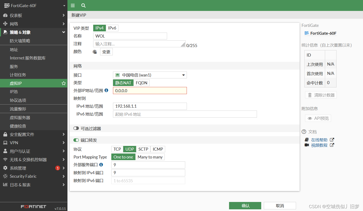 ①登录飞塔防火墙,选择策略&对象-->虚拟IP-->新建-->虚拟IP,将内网192.168.1.1的PC主机端口9映射出去。
