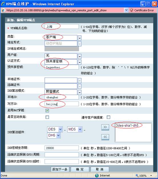 1)先添加端点,然后添加隧道。端点中 IKE 组件 要选择 3DES-MD5-DH5 。