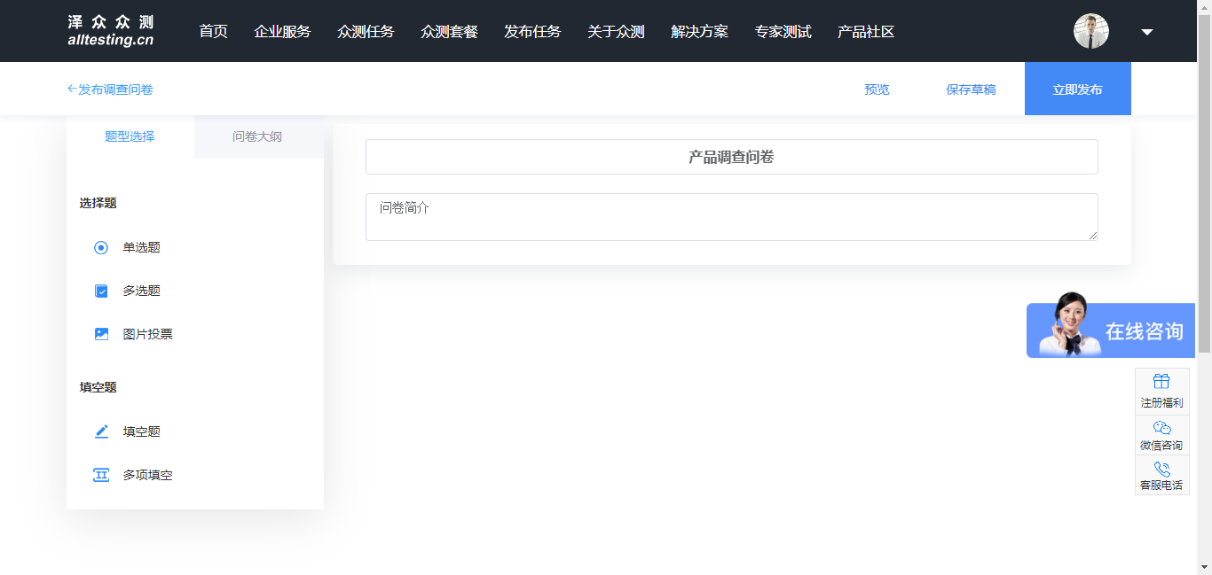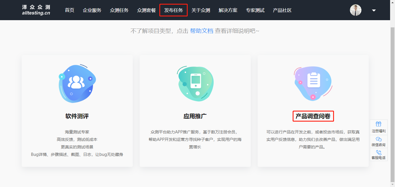 进入泽众众测首页https://zc.alltesting.cn/,点击菜单“发布任务”-“产品调查问卷”(请在泽众云测试注册,统一登录后。)。