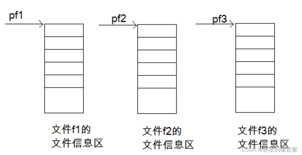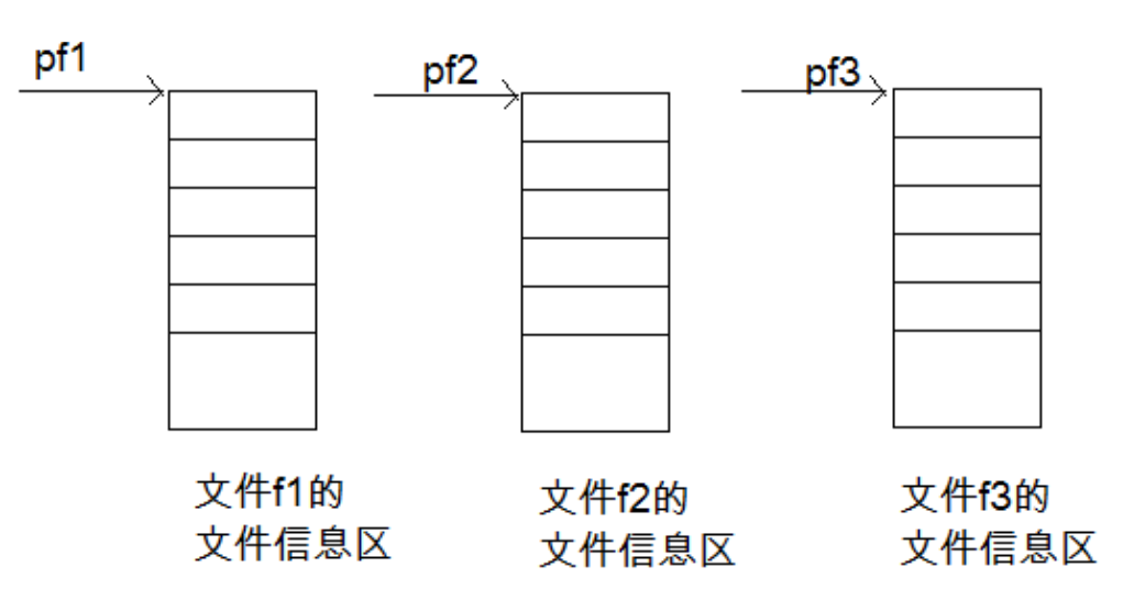 而文件的指针与文件之间的交互是通过一个名为文件信息区的区域,指针通过访问文件信息区对文件进行读写操作。关系如下图:利用文件指针pf1,pf2,pf3,通过访问文件信息区来间接操作文件。(这个有个概念就行)