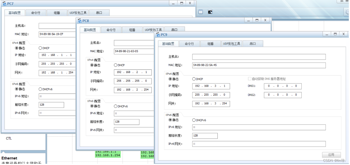1.配置PC7、PC8、PC9的ip,子网掩码和网关