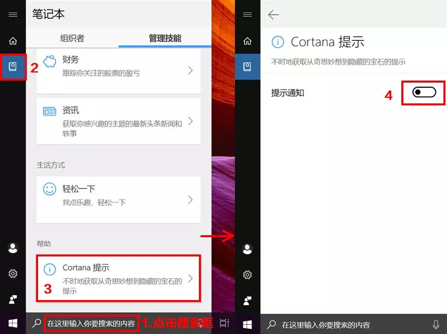 点击搜索框打开Cortana,依次点击【笔记本】【Cortana提示】,【关闭】“提示通知”。