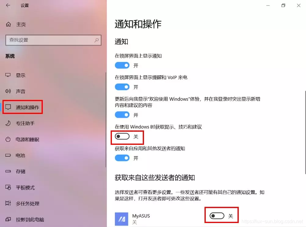 依次点击【开始】【设置】【系统】【通知与操作】,【关闭】“在使用Windows时获取提示、技巧和建议”,还可以对应用程序关闭【获取来自这些发送者的通知】。