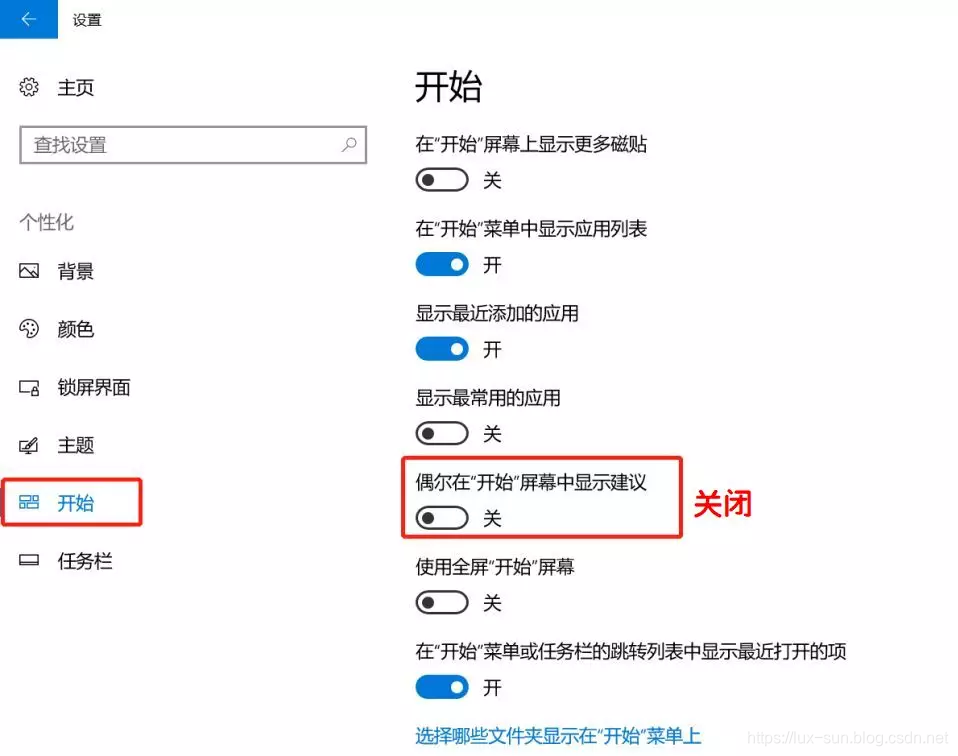 依次点击【开始】【设置】【个性化】【开始】,【关闭】偶尔在“开始”屏幕中显示建议。后续开始菜单将不再出现推荐软件。