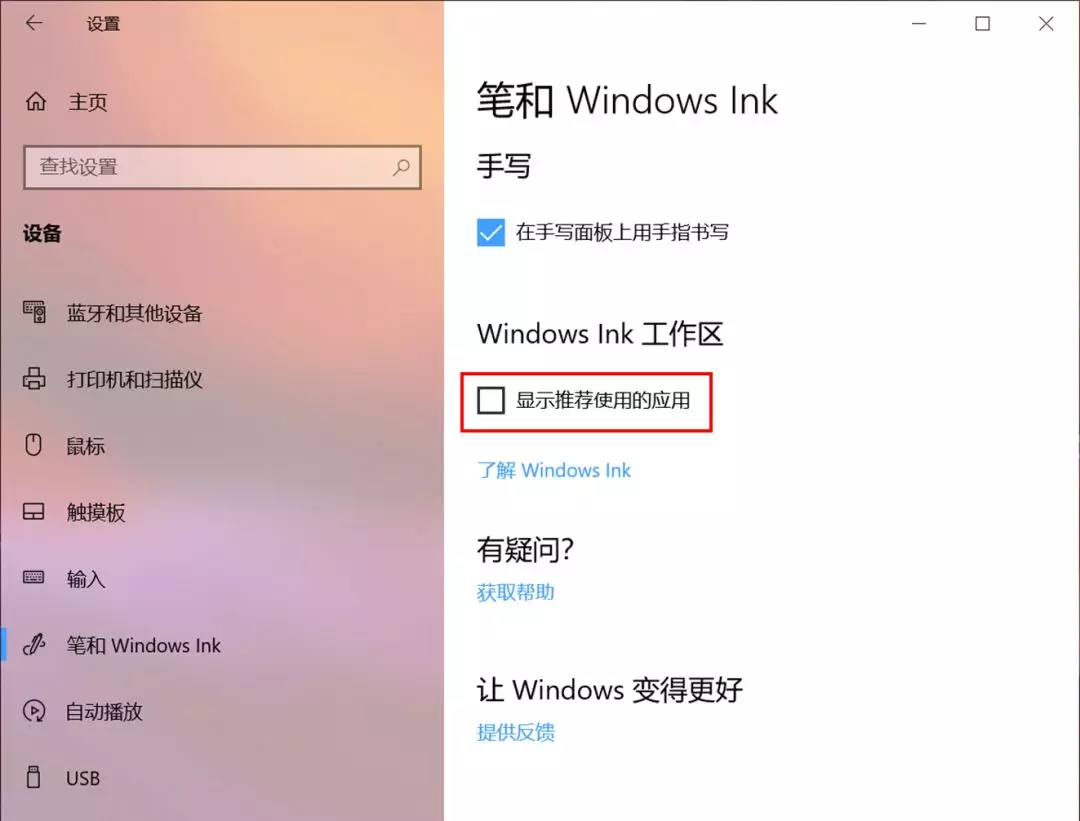 依次点击【开始】【设置】【设备】【笔和Windows Ink】,取消勾选【显示推荐使用的应用】。