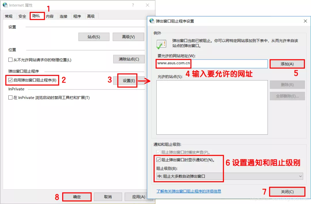 【添加】要允许的网站地址,并设置“通知和阻止级别”,完成后点击【关闭】并回到“Internet属性”窗口,点击【应用】并【确定】。
