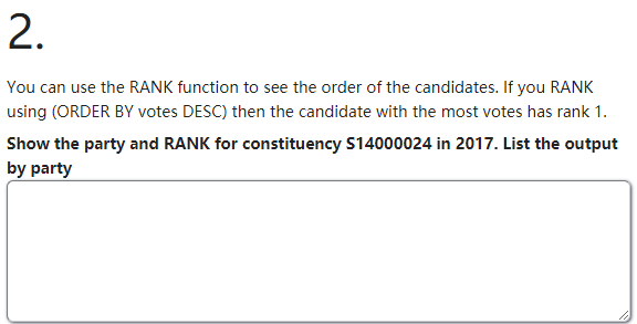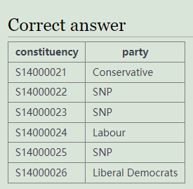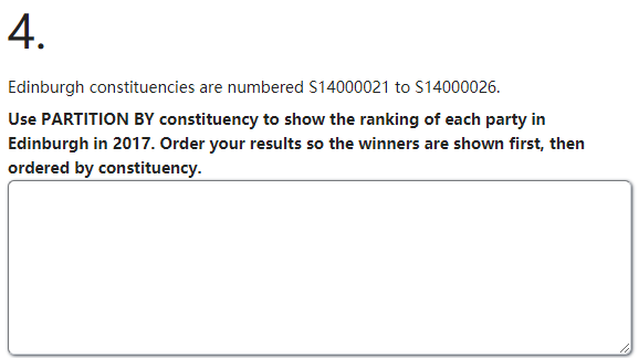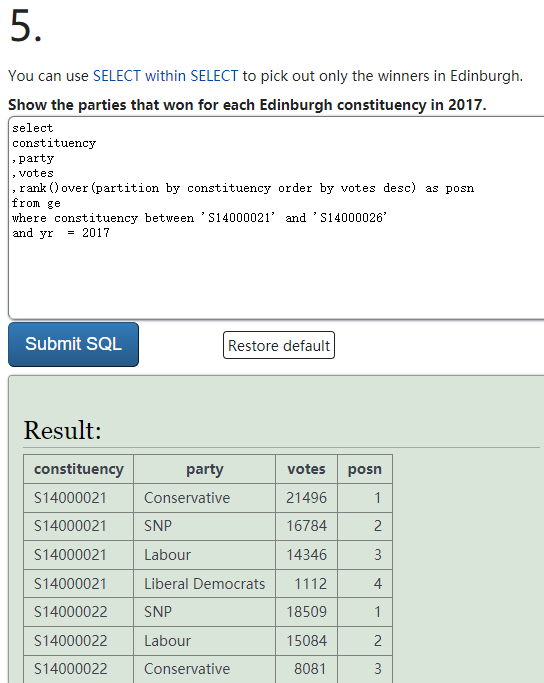 - 查询2017年所有在爱丁堡的选区当选议员所在的选区即对应的团队party