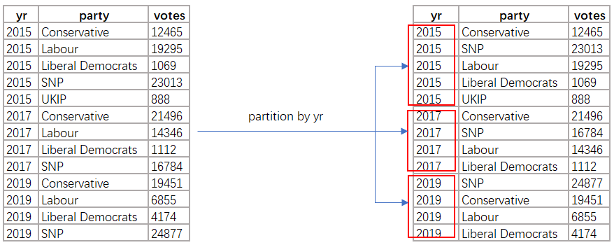 - 对窗口函数rank()over(partition by yr order by votes desc) as posn进行拆解