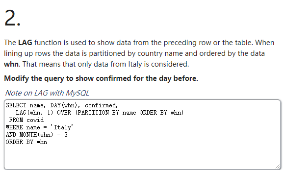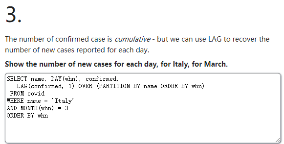- 修改给出的代码,使用LAG函数查询三月份意大利每日新增确诊数