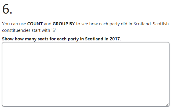 - 查询2017年在苏格兰的选区内(选区编号以S开头的)每个团体获得的席位数