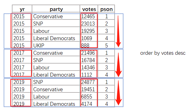 - order by votes desc对分区内的选票数从高到低排序并给它一个排名的编号,最后得到pson列