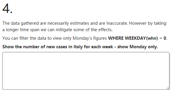 - 查询意大利每周新增确诊数(显示每周一的数值 weekday(whn) = 0)