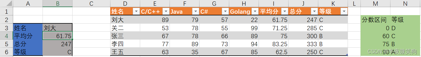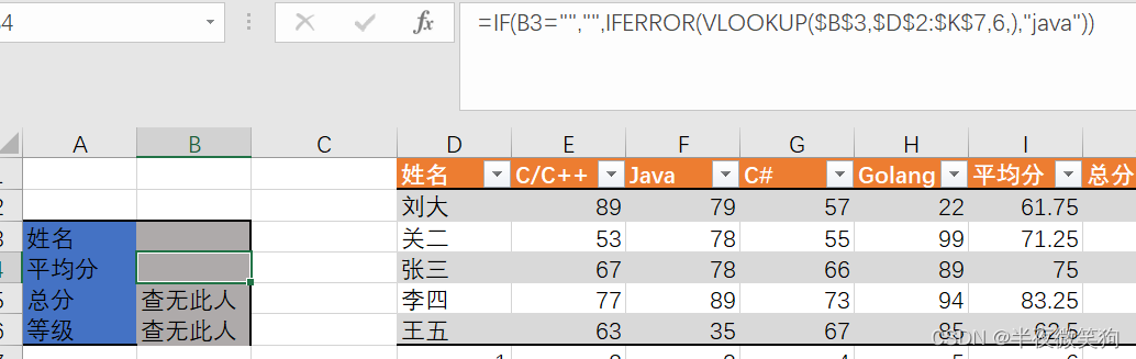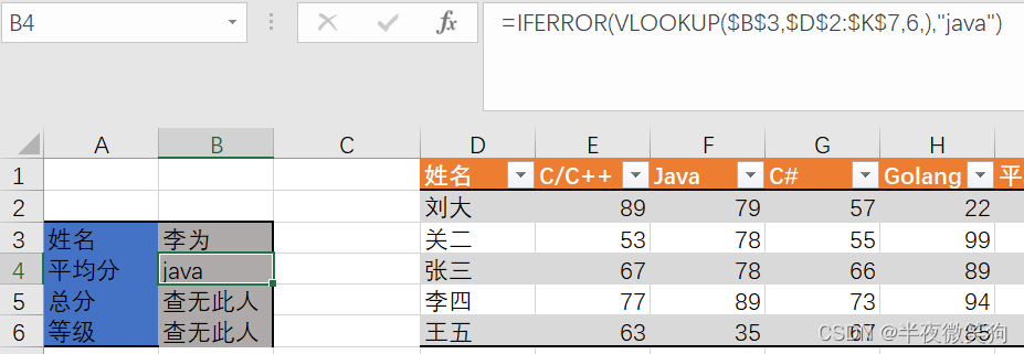 共有4个参数:①关键字,如平均分的参考参数为B3的姓名 ②填资料范围:如D2:K6 ③填表格中列的次序:从左往右从1开始数。到平均分刚还是6。④选择TRUE(模糊查询)或者FALSE(精确查询)。