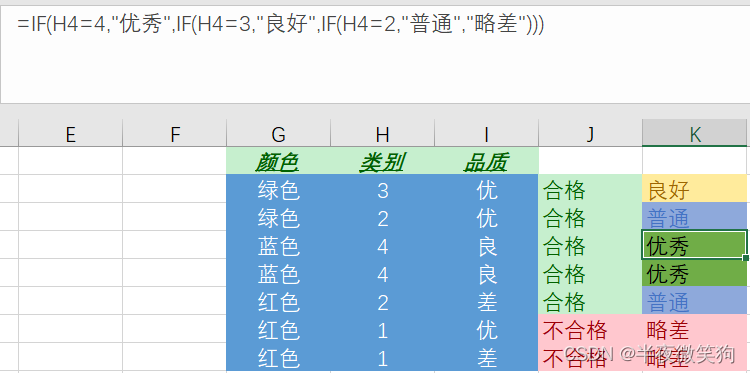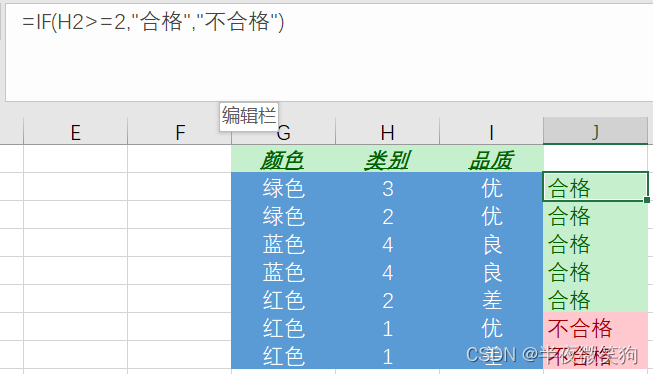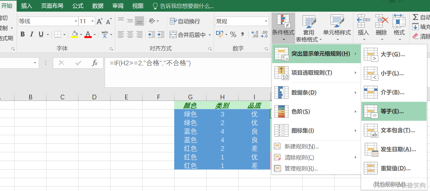 4、IF函数:第一个引数为判断条件,第二个是合格的执行语句(如图9.4中为合格和不合格)。小升级:可以在开始模块中的条件格式中选择突出显示单元格规则中的等于。可以显示填充色等如图9.5。