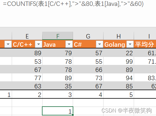 8、COUNTIFS函数和SUMIFS函数:先来看基础版:COUNT可以统计数字但文字不能。COUNTA可以统计文字了。COUNTIFS格式为:=COUNTIF(范围,条件,范围,条件。。。),如图9.11所示为选出C/C++>80且JAVA>60的;
