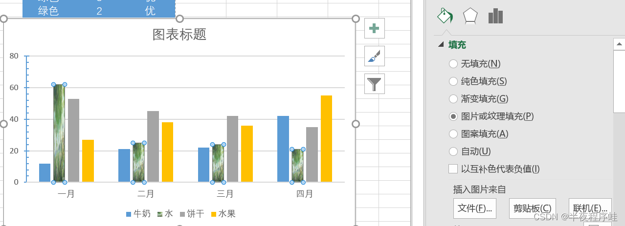 小提示:①在点击图表后,添加图标元素和更改图表类型。 ②鼠标右键点击设置坐标轴格式改东西。③柱图鼠右键-点击填充图标-图片或纹理填充可以改柱子的图片。如图5.2: