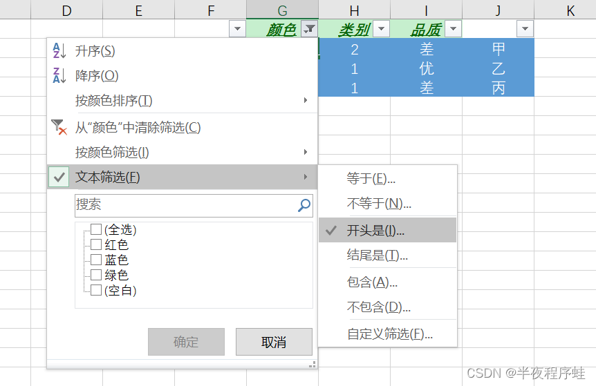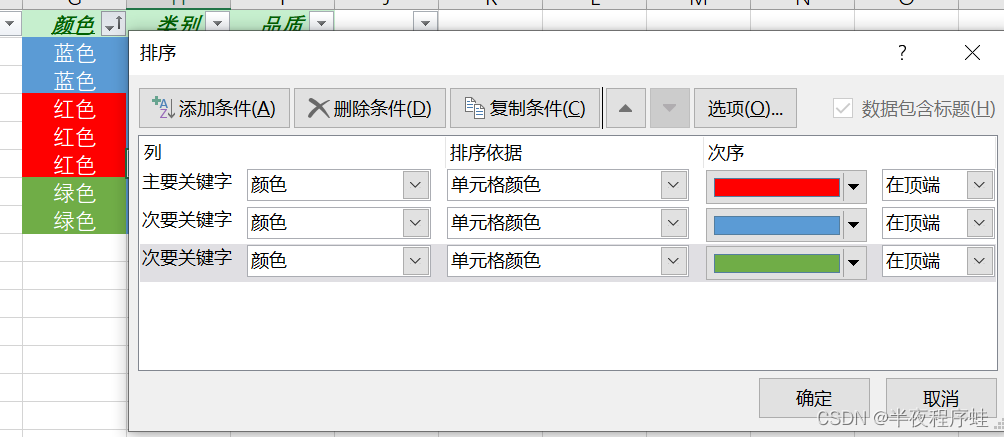 可以按照色彩来排序在按颜色单列筛选-按颜色筛选中的自定义中如图2.7: