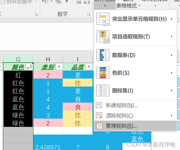 设定颜色可以在开始-条件格式中设定,取消格式设定用。如图2.8