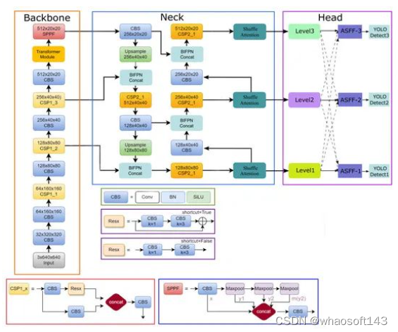下图就展示了我们改进模型的网络结构。根据上述方法,我们对原始YOLOv5算法进行了一系列改进。首先,将Transformer模块插入YOLOv5的主干中。Transformer的自注意机制能够增强模型的全局感受野,获得更多的上下文信息,并为原始卷积层带来互补优势,更有利于捕捉茶叶病害的全局特征。