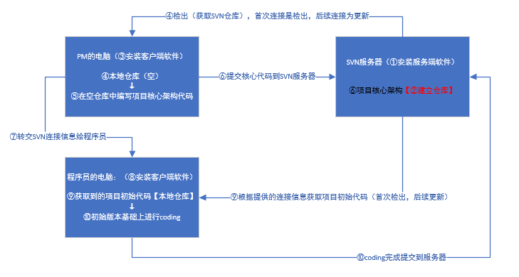 ⑦开发经理会把svn服务器仓库的地址给到程序员,这个地址是svn协议的地址