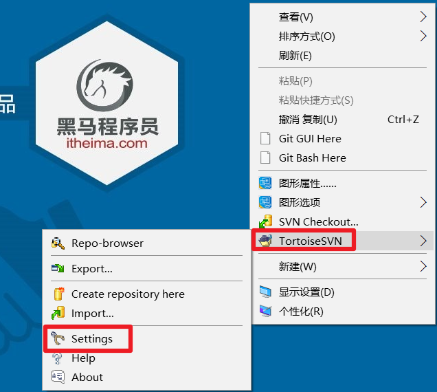 桌面或空白处 右键菜单->TortoiseSVN->settings