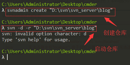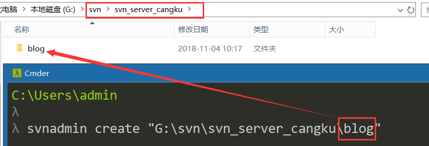 这里先在G盘新建svn\svn_server_cangku目录,然后打开命令行窗口执行命令创建blog仓库。