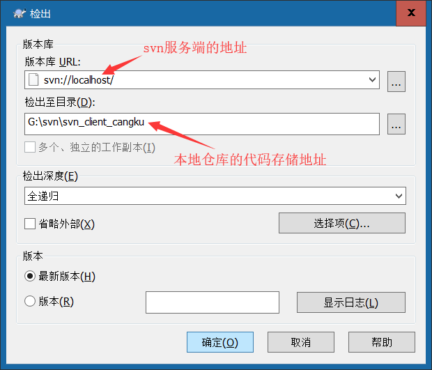 在需要使用仓库时比如检出操作时,在svn://localhost后面加上/仓库名称: