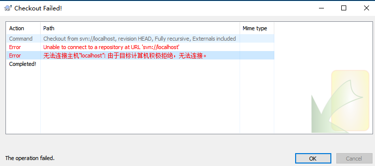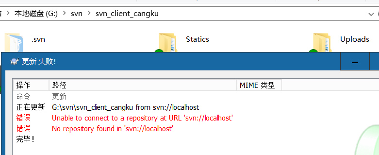 如果在以后的使用中,出现以下错误,就是由于svn服务没有开启(在linux下可能还由于防火墙没允许)。