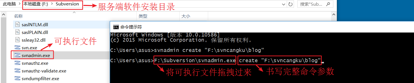 ③svnadmin 命令本身对应一个可执行文件svnadmin.exe,可以拖拽到命令行直接执行。