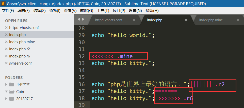 注:冲突是发生在客户端本地的,版本回退也是在本地回退,svn仓库中的代码是不受影响的,各个版本在svn仓库中都还是存在的。