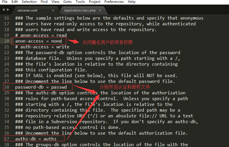 ①打开该仓库主配置文件svnserve.conf,关闭匿名用户的访问权限