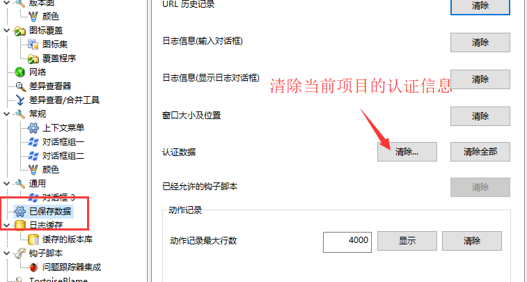 保存认证信息后,不会再次弹出认证界面,如果需要更改认证信息(用户名和密码),则需要先清除svn保存的认证信息