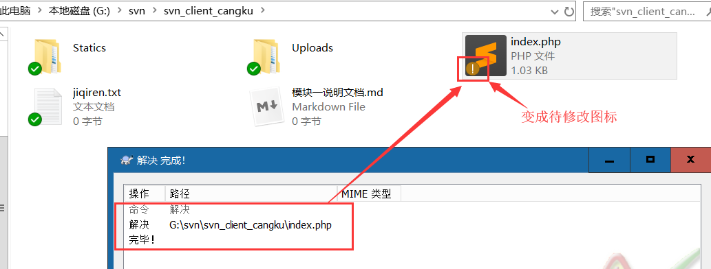 ②选中冲突的文件,右键->TortoiseSVN -> resolve(解决)解决冲突,这个操作是标记文件,表示这个冲突已经被处理,代码可以直接提交了。操作之后会自动把冲突产生的多余文件删除。