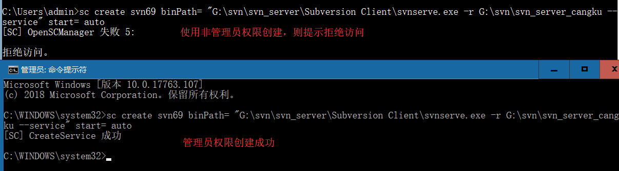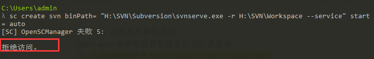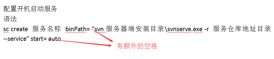 示例:sc create svn binPath= "H:\SVN\Subversion\svnserve.exe -r H:\SVN\Workspace --service" start= auto