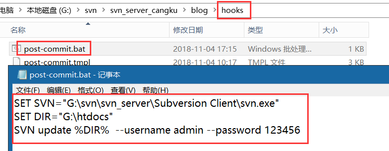 ③打开服务器的Blog仓库,找到hooks钩子目录,新建一个post-commit.bat批处理文件,然后输出如下代码(需要根据实际情况修改里面的内容)