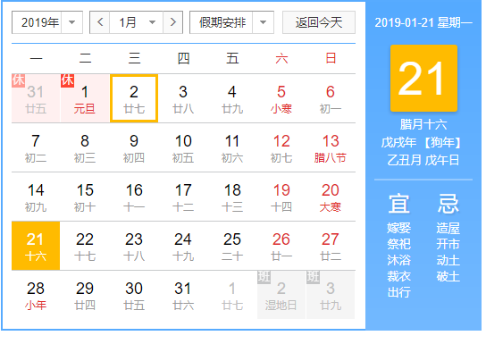 因为要做一个人员考勤功能,因为是区间查询,只有开始时间和结束时间,要剔除节假日和双休日,而公司没有维护这些信息,网上找了下好像没有现成的,没办法只能用笨办法,花了个吧小时从百度日历里面统计了2019年的节假日情况。