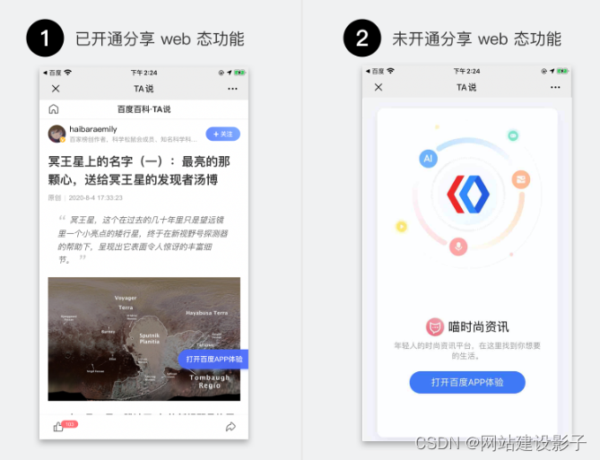 百度官方的描述是这样的:将小程序内容分享至百度 App 端外后,用户在回流页只能看到通用回流引导,无法查看分享的具体内容,获取分享信息的路径较长且回流折损高。因此,百度智能小程序为开发者提供了分享 Web 态功能,可以将小程序自动转化成 Web 版本,其功能和内容展示与小程序基本一致,能在端外的回流页直接展现用户分享的小程序内容,为用户提供优质的闭环体验,提升用户回流率及转化率,也能更好的刺激用户分享。