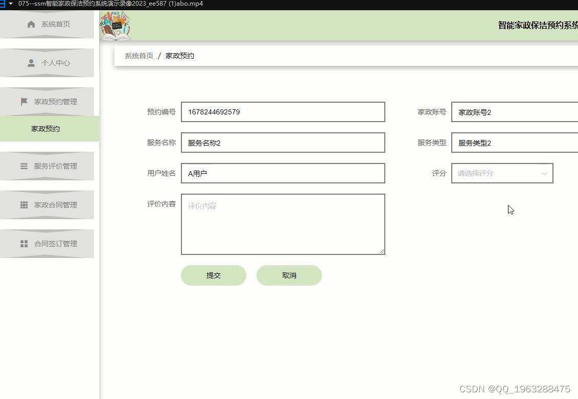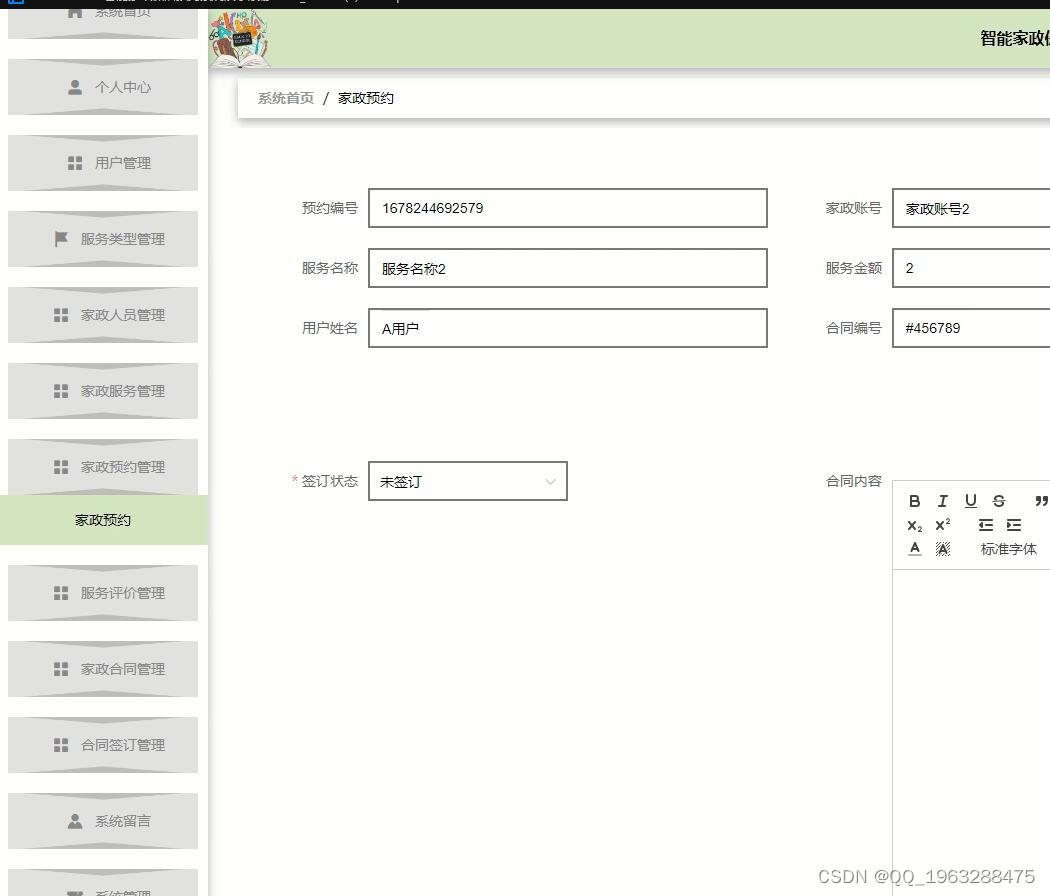 该系统利用Java语言、MySQL数据库,结合目前流行的 B/S架构,将智能家政保洁预约管理的各个方面都集中到数据库中,以便于用户的需要。该系统在确保系统稳定的前提下,能够实现多功能模块的设计和应用。该系统由管理员功能模块、家政人员功能模块和用户模块组成。不同角色的准入制度是有严格区别的。管理员端的功能主要是开放给系统的管理人员使用,能够对个人中心、用户管理、服务类型管理、家政人员管理、家政服务管理、家政预约管理、服务评价管理、家政合同管理、合同签订管理、系统留言、系统管理等进行查询,修改和删除等,对系统整体运行情况进行了解。
