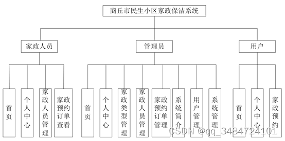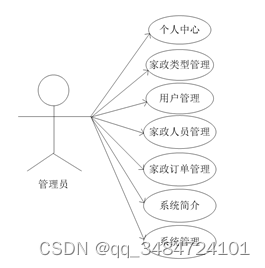 小区家政保洁系统具有管理员、家政人员以及用户三类角色。这三个角色的功能模块以及对应的用例图如下所示,管理员的用例图如图2-1所示: