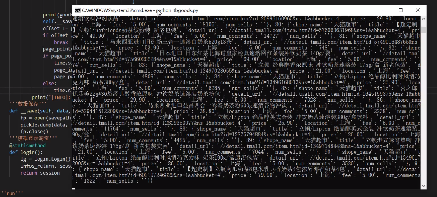 def run(self):search_url = 'https://s.taobao.com/search?'while True:goods_name = input('请输入想要抓取的商品信息名称: ')offset = 0page_size = 44goods_infos_dict = {}page_interval = random.randint(1, 5)page_pointer = 0while True:params = {'q': goods_name,'ajax': 'true','ie': 'utf8','s': str(offset)}response = self.session.get(search_url, params=params)if (response.status_code != 200):breakresponse_json = response.json()all_items = response_json.get('mods', {}).get('itemlist', {}).get('data', {}).get('auctions', [])if len(all_items) == 0:breakfor item in all_items:if not item['category']:continuegoods_infos_dict.update({len(goods_infos_dict)+1: {'shope_name': item.get('nick', ''),'title': item.get('raw_title', ''),'pic_url': item.get('pic_url', ''),'detail_url': item.get('detail_url', ''),'price': item.get('view_price', ''),'location': item.get('item_loc', ''),'fee': item.get('view_fee', ''),'num_comments': item.get('comment_count', ''),'num_sells': item.get('view_sales', '')}})print(goods_infos_dict)self.__save(goods_infos_dict, goods_name+'.pkl')offset += page_sizeif offset // page_size > 100:breakpage_pointer += 1if page_pointer == page_interval:time.sleep(random.randint(30, 60)+random.random()*10)page_interval = random.randint(1, 5)page_pointer = 0else:time.sleep(random.random()+2)print('[INFO]: 关于%s的商品数据抓取完毕, 共抓取到%s条数据...' % (goods_name, len(goods_infos_dict)))