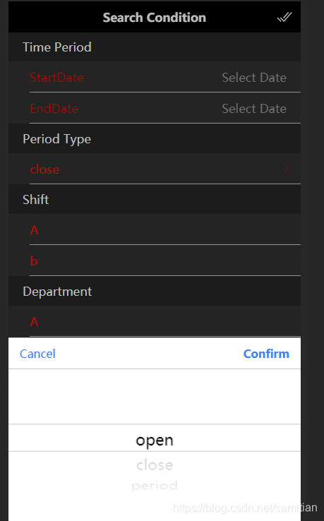 export class SearchconditionPage implements OnInit {public period = 'period';constructor(private navCtl: NavController,private pickCtl: PickerController,) { }ngOnInit() {}public onDone() {this.navCtl.back();}public async pickPeriod() {const opts: PickerOptions = {buttons: [{text: 'Cancel',role: 'cancel'},{text: 'Confirm',handler: (v) => {this.period = v['periodType'].value;}}],columns: [{name: 'periodType',options: [{text: 'open', value: 'open'},{text: 'close', value: 'close'},{text: 'period', value: 'period'},]}]};const picker = await this.pickCtl.create(opts);picker.present();}public async pickShift() {}}