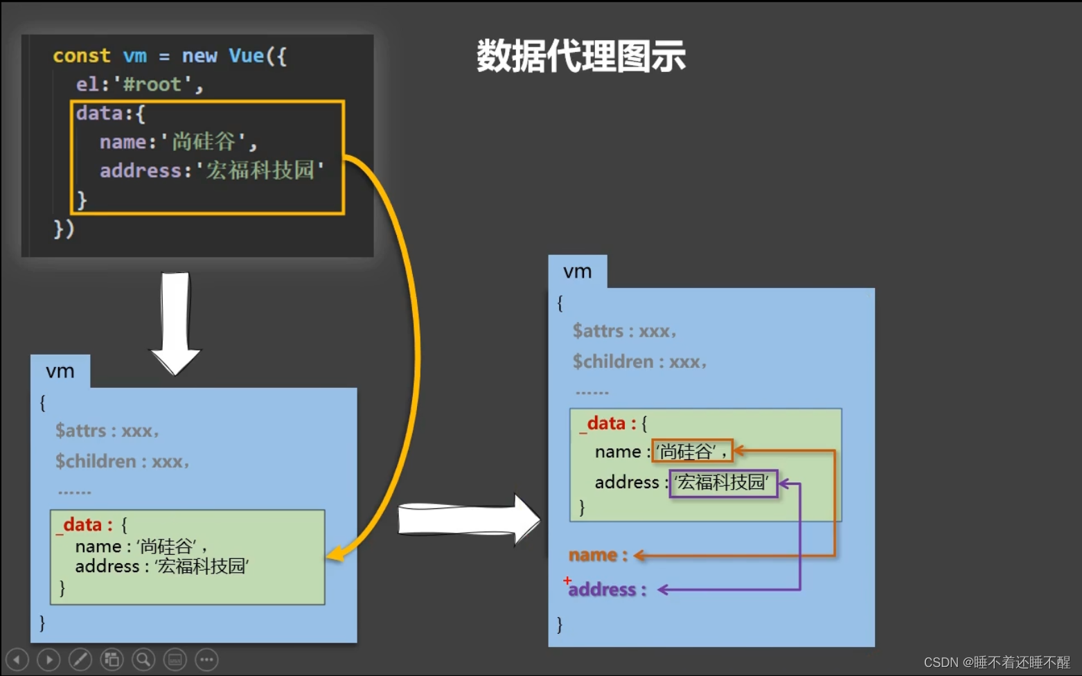 Vue.config.productionTip=falseconst v=new Vue({// el:'#root', el的第一种写法/*data的第一种写法data:{name:'尚硅谷'},*/data:function(){console.log(this) //如果是普通函数,此处的this是Vue实例对象;如果是箭头函数,this则为Windowreturn {name:'尚硅谷'}}})v.$mount('#root')