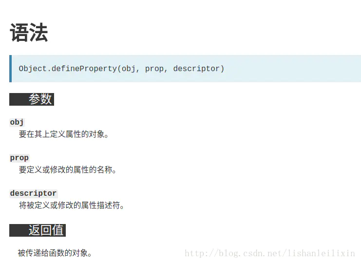 简单的说,他可以控制一个对象属性的一些特有操作,比如读写权,是否可枚举,这里我们主要研究它的get和set方法,如果想清楚更多用法,可以参考:https://developer.mozilla.org/zh-CN/docs/Web/JavaScript/Reference/Global_Objects/Object/defineProperty