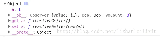 在打印结果中我们可以看到属性a有两个方法:get和set.为什么会有这两个方法呢,这正是vue通过Object.defineProperty()进行数据劫持的.