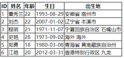 ID 姓名 年龄 生日 出生地 {user.id}}{{user.name}} {{user.age}} {{user.birthday}} {{user.city}} -->