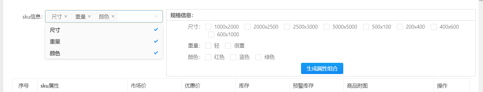 三个商品属性组,每个属性组中有若干属性值,在下拉控件中选中属性组后,在右侧复选控件中选择一个或多个属性值,再根据笛卡儿积组合生成商品sku列表(如下图):