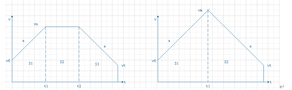 如左图所示,当采用梯形加速度法规划速度曲线时,初速度为𝑣0,末速度为𝑣t,正常运行速度为𝑣n。加速度段走过的距离s1=(𝑣n2-𝑣02)/2a,减速段曲线运行距离s3=(𝑣n2-𝑣t2)/2a,则恒速段走过的距离s2=s-s1-s2。若s2>0,则证明有恒速段,加速段和匀速段总距离sk为s1+s2。
