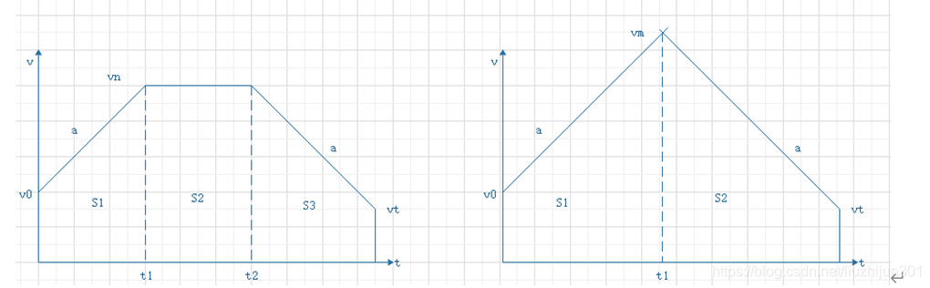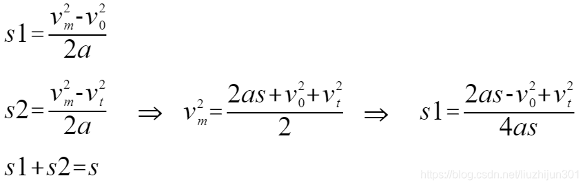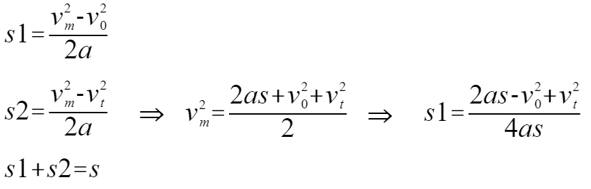 当s2<0时没有恒速段时,曲线退化为只有加速和减速过程,如上边右图所示,设加速段和减速度段交点处速度为𝑣m,则有关系式: