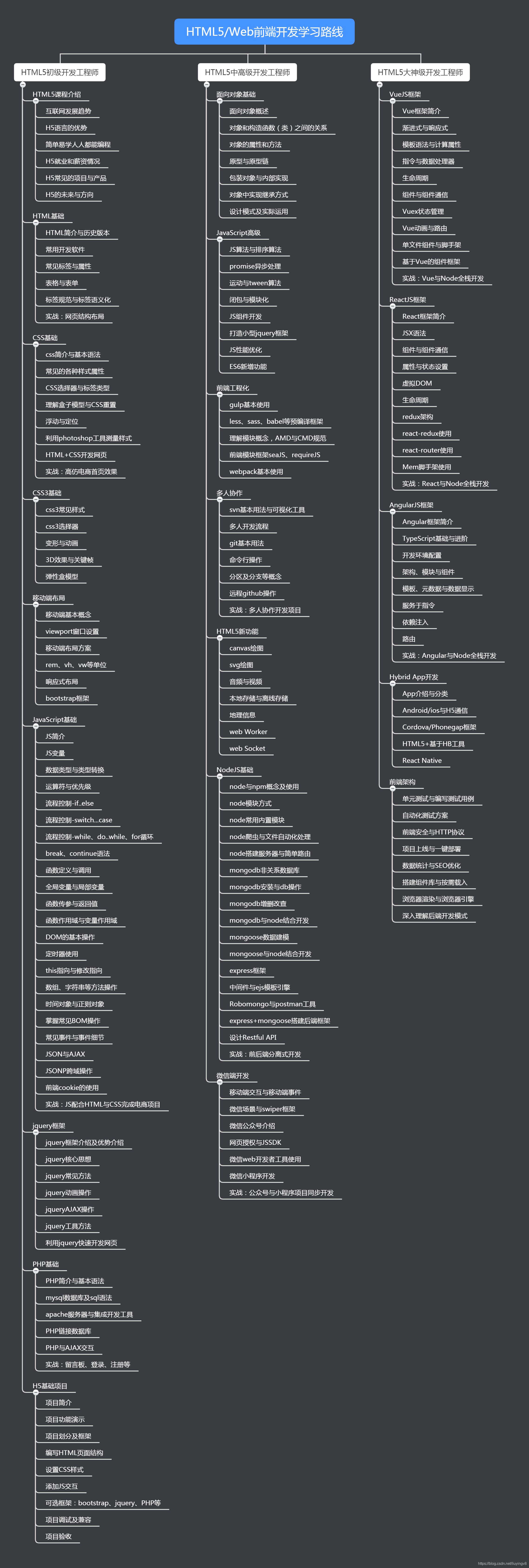 以下是自己做的一个从初级前端开发工程师到大神级别前端开发工程师的学习路线思维导图,希望可以帮到大家: